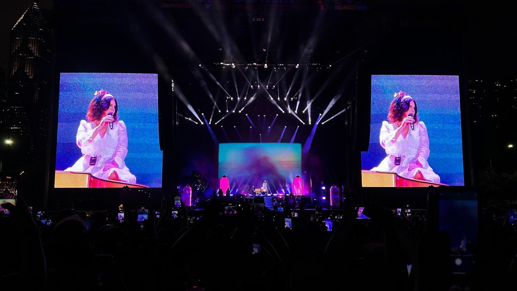 Sauntering out with her hair in a ‘60s-inspired beehive, Del Rey took the Bud Light stage just after 8:30 p.m. Dressed in a gorgeous short white dress that resembled her 2016 Lollapalooza performance at the very same stage, she opened with “A&W.” Her attire was the first of many homages to past incarnations of her career that all landed as nostalgic and evolved rather than repetitive. Shortly after arriving onstage, she sat and sang as a hairdresser pinned shimmering butterfly clips into her beehive, revamping her distinct early 2010’s aesthetic that remains a fixture for her audience.