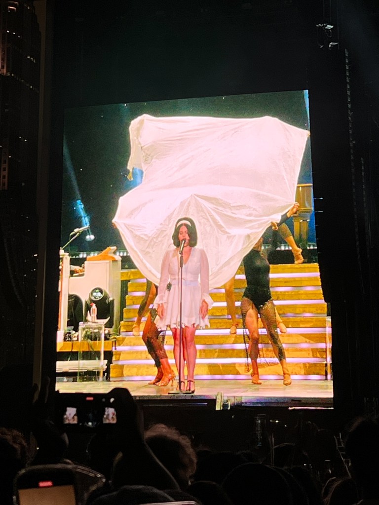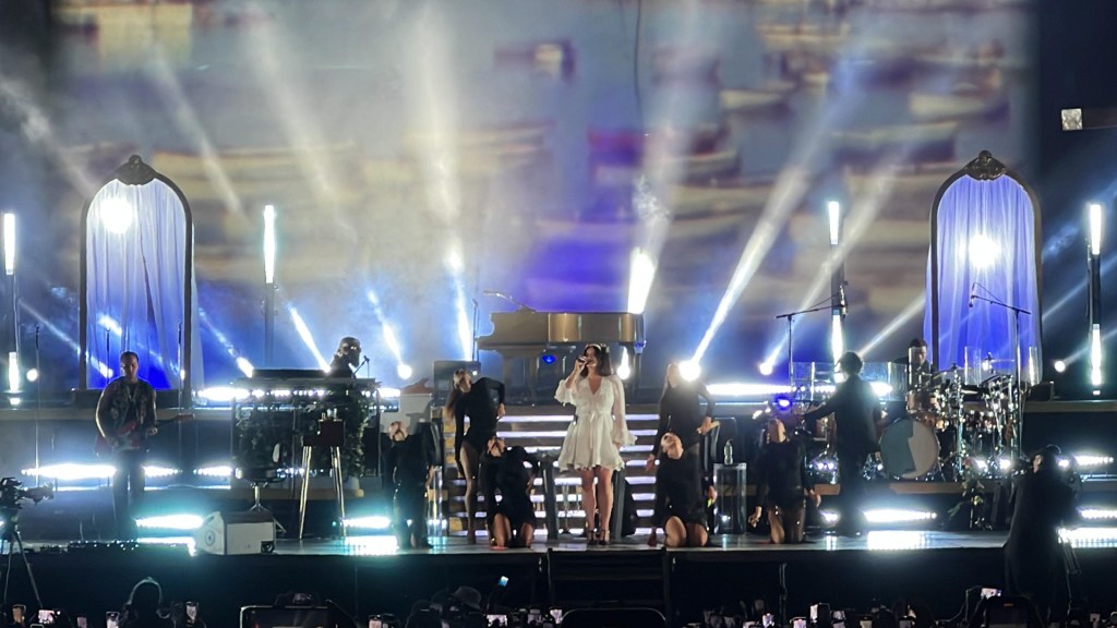 After telling the crowd that one song had to be cut due to a strict curfew, she went into a captivatingly poignant performance of “hope is a dangerous thing for a woman like me to have – but I have it.” The performance included aerial spins and a male “dancer” who stood in place with angst and donned a “CIA” badge. All of which led to her being carried offstage while sitting on a white sheet. Though the quirks of the performance garnered a couple chuckles from surrounding audience members, it was quintessentially Del Rey to its core.